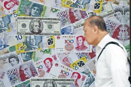 A man walks past an advertisement promoting China’s renminbi (RMB) or yuan, U.S. dollar and Euro exchange services at foreign exchange store in Hong K