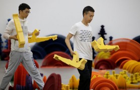 Chinese artist Li Hongbo and his assistant carry paper sculptures in the shape of AK 47 assault rifles as they set up Li’s work «Ocean of Flowers» in Beijing