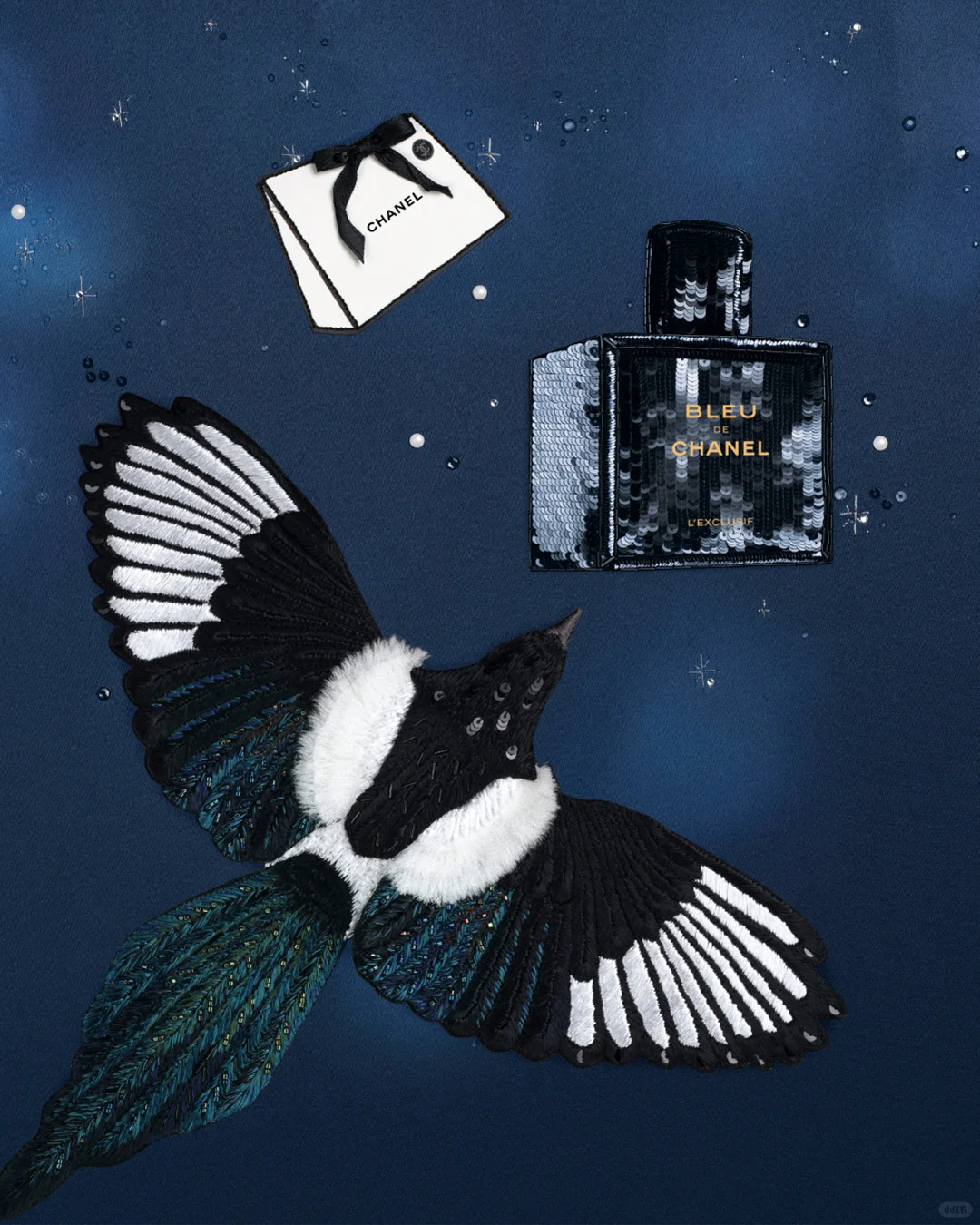 Креатив кампании оформлен в виде композиции на темно-синем ночном фоне: продукты Chanel представлены как сверкающее созвездие, выполненное в стиле вышивки пайетками. Визуал дополнен традиционными символами Цисицзе — сорокой и облаками.
