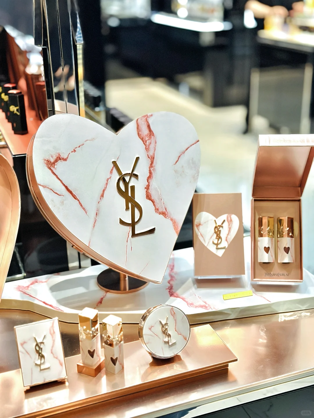 YSL предложил лимитированную серию «Розовое золото и мрамор» в праздничной упаковке. В Китае лицом коллекции стала актриса Цю Тянь — в кампании она представила образ с тенями в оттенке шампанского и нюдовой помадой с легким коричневым тоном.