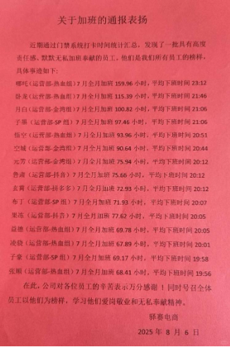 — Шанхайскую компанию раскритиковали за поддержку переработок. Компания Yisai из Шанхая оказалась в центре скандала после публикации ведомости с благодарностью 15 сотрудникам, которые больше всего работали сверхурочно в июле. Работник с самым высоким рейтингом трудился больше положенного почти на 160 часов, в среднем заканчивая смену в 23:12. Сотрудник на последнем места рейтинга переработал 68 часов за месяц, уходя в среднем в 19:56. Компания назвала таких сотрудников «образцом для всех» и призвала других последовать их примеру. При этом переработки оплачиваются, только если назначены руководством. Если сотрудники трудятся «добровольно», компенсация не предполагается.