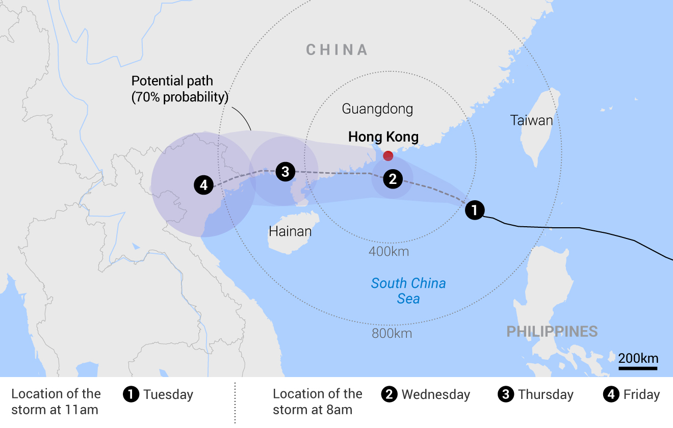 «Рагаса», который изначально нес ветер скоростью свыше 50 м/с с порывами до 75 м/с достиг Гонконга в ночь на 24 сентября. В мегаполисе пострадал 101 человек. Ущерб был нанесен ряду зданий. Власти получили более 1 тыс. сообщений о рухнувших деревьях, зарегистрировано 22 случая затопления в прибрежных районах и 4 оползня. Международный аэропорт города, где около 1 тыс. рейсов были отменены или задержаны, ночью 25 сентября возобновил работу.