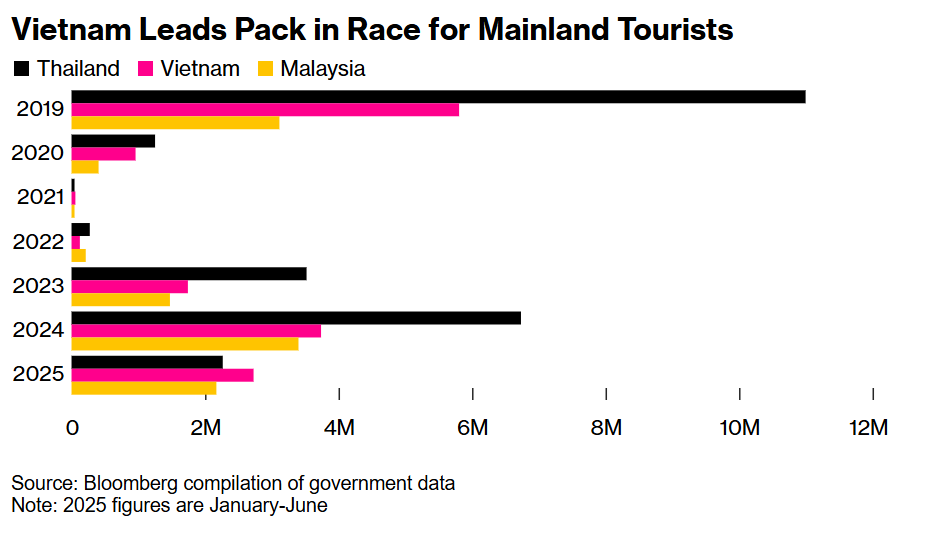 Вьетнам стал новым лидером среди направлений для китайских туристов, опередив Таиланд. С января по август 2025 года страну посетили почти 14 млн иностранцев, из которых 3,5 млн — жители материкового Китая. Поток из КНР вырос на 44% в годовом выражении. При этом поездки в Таиланд сократились примерно на 35% из-за опасений за безопасность после громкого похищения китайского актера Ван Сина и сообщений о деятельности мошеннических центров. Страна рискует потерять до $3,5 млрд доходов. Эксперты отмечают, что изменились сами туристы. Более 40% китайцев, впервые путешествующих за границу, — это самостоятельные, образованные путешественники, ищущие «аутентичные» впечатления и готовые тратить больше.