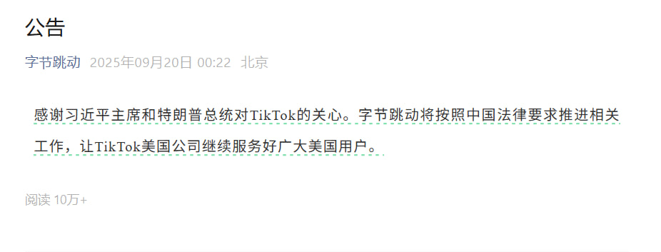 Корпорация ByteDance (разработчик TikTok и Douyin) объявила 20 сентября в официальном WeChat-аккаунте о намерении продолжить работу TikTok в США, соблюдая «требования китайского законодательства». В англоязычной версии сообщения компания пообещала действовать «в соответствии с применимыми законами». Не уточняется, предусматривает ли сделка продажу части американских активов TikTok инвесторам из США.