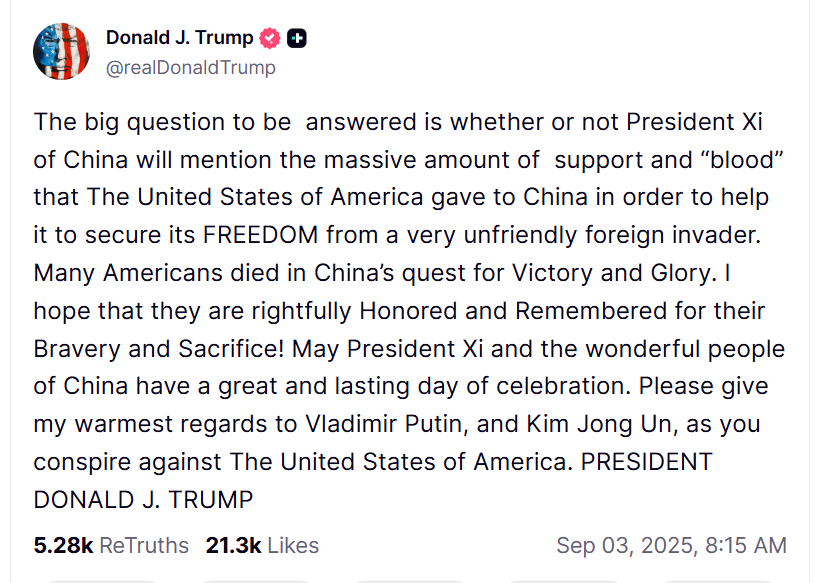 — Трамп передал привет «готовящим заговор против США» главам КНР, РФ и КНДР. Президент США Дональд Трамп призвал председателя КНР Си Цзиньпина не забывать американскую помощь во Второй мировой войне. «Большой вопрос, на который нужно ответить, заключается в том, упомянет ли китайский председатель Си [Цзиньпин] о той огромной помощи и той «крови», которые США предоставили Китаю, чтобы помочь ему отстоять СВОБОДУ от очень недружелюбного иностранного захватчика. Многие американцы погибли в борьбе Китая за его победу и славу. Я надеюсь, что их по праву будут чтить и помнить за храбрость и самопожертвование», — написал он в социальной сети Truth Social.