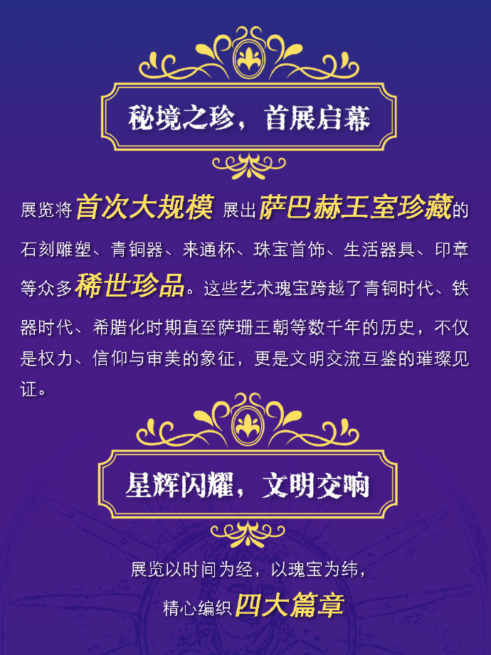 Первая масштабная выставка редких сокровищ из королевской коллекции Кувейта музея Аль-Cабах. Экспозиция включает каменные скульптуры, бронзовые изделия, ювелирные изделия и предметы быта и охватывает тысячи лет истории – от бронзового века до эпохи Сасанид.