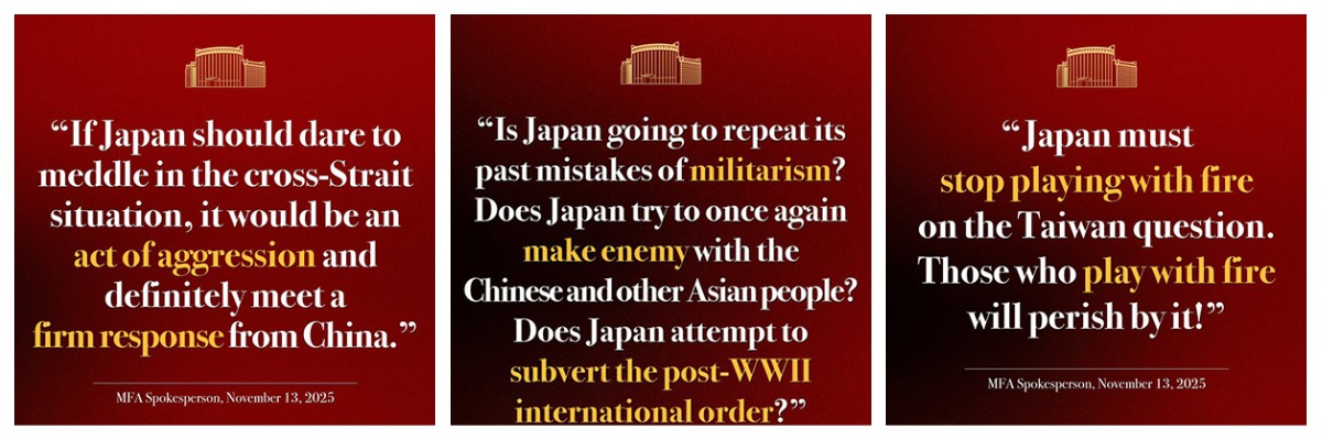 Это вызвало резкое недовольство Пекина, который сделал Токио серьезное представление и вызвал посла Японии. Генеральный консул Китая в Осаке Сюэ Цзянь в соцсети X пригрозил, вероятно, японскому премьеру «отрубить грязную голову, если она посмеет самовольно сунуться». В дальнейшем запись была удалена. Китайские госСМИ возобновили критику японской политики, напоминая о военной истории и выступая против усиления японского оборонного курса. 13 ноября аккаунт МИД разместил в X баннеры на японском и английском языках с предупреждениями.