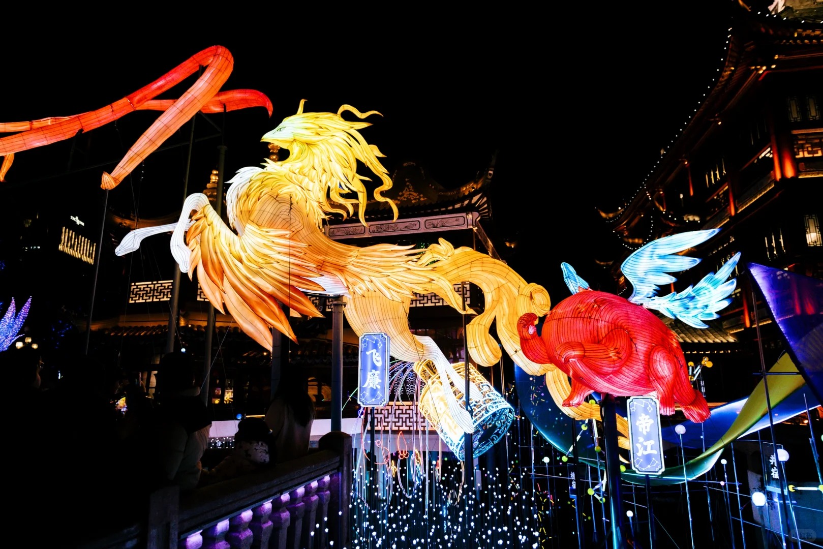 Одна из самых зрелищных традиций китайского Нового года — праздничная инсталляция фонарей в историческом квартале у сада Юйюань.