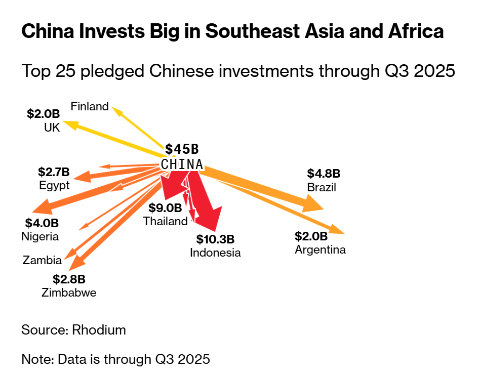 Крупнейшие направления китайских иностранных инвестиций. Источник: Bloomberg
