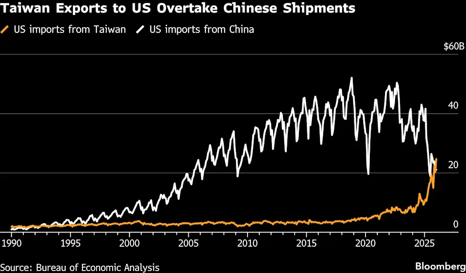Резкий рост поставок с Тайваня в США отражает масштабное расширение импорта чипов и серверов для компаний, занимающихся ИИ, что полностью меняет торговый профиль острова. Китайские экспортеры все больше диверсифицируют деятельность, отказываясь от поставок в США из-за значительно более высоких тарифов, введенных президентом США Дональдом Трампом. За 2025 год дефицит товарооборота США с материковым Китаем сократился на $93 млрд и составил $202 млрд. В то время как с Тайванем он увеличился более чем вдвое, почти до $147 млрд.