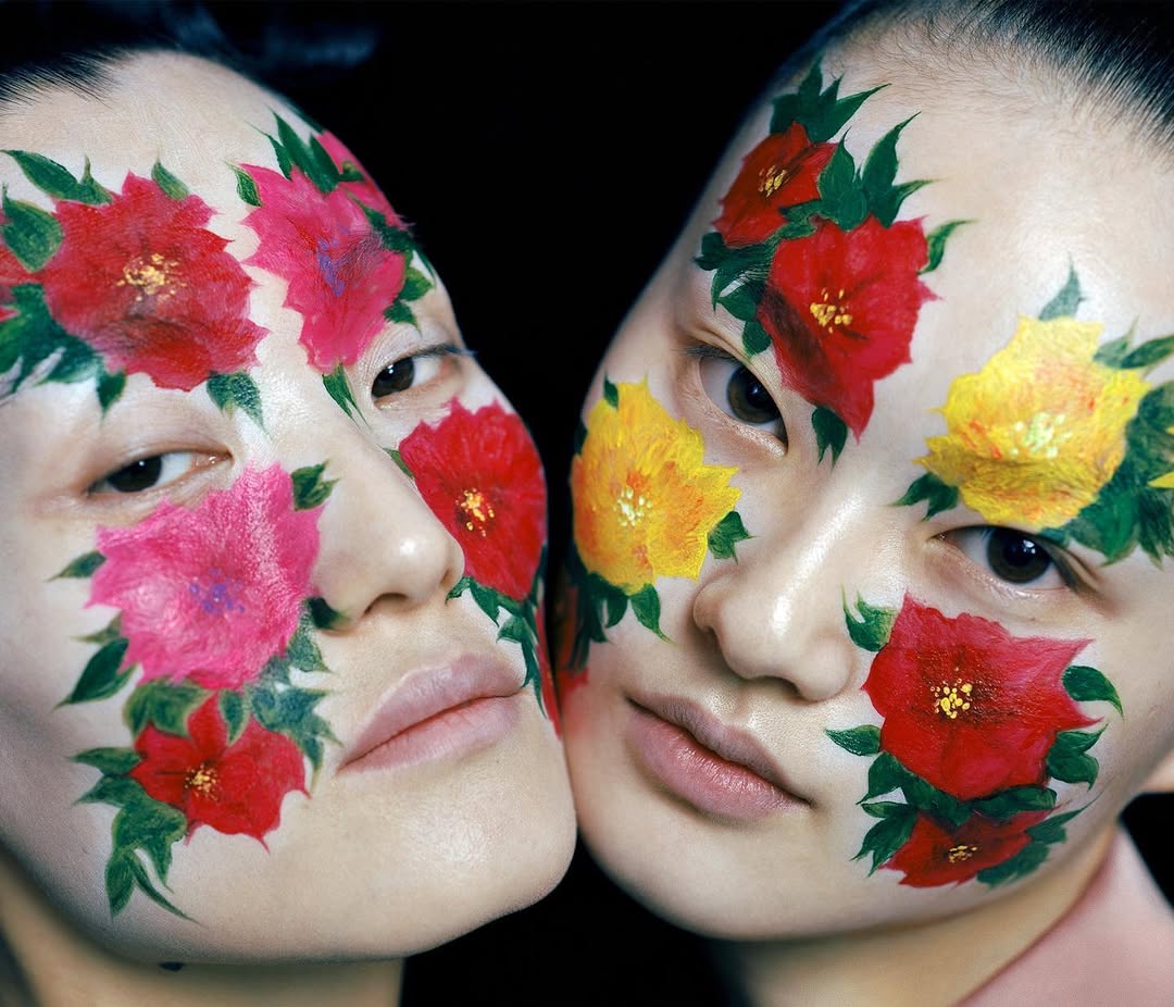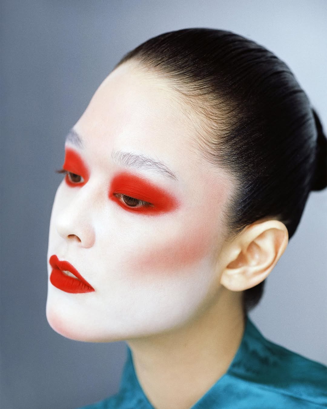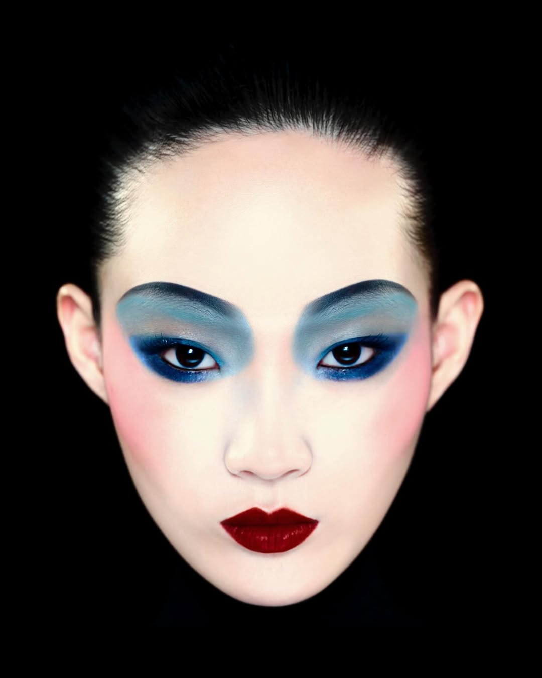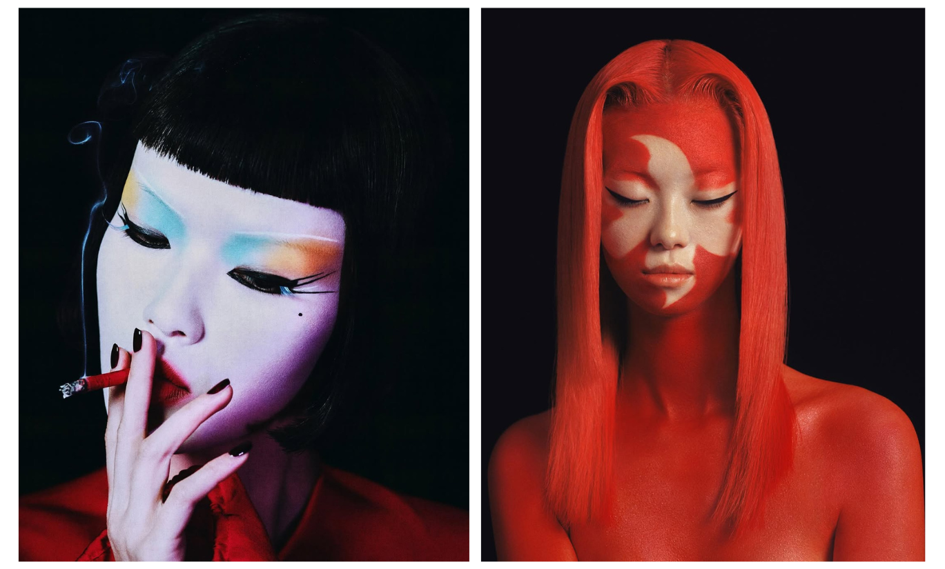 Фотограф часто использует акцентный макияж на моделях: выбеленное лицо и яркие тени, губы или румяна. Образы напоминают грим китайских оперных артистов.