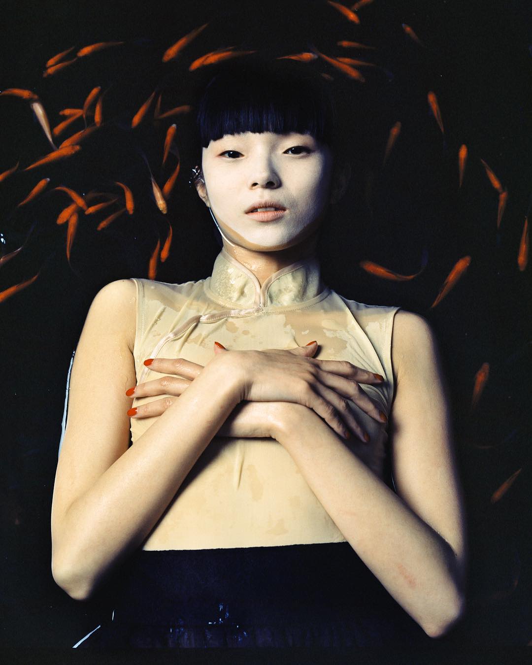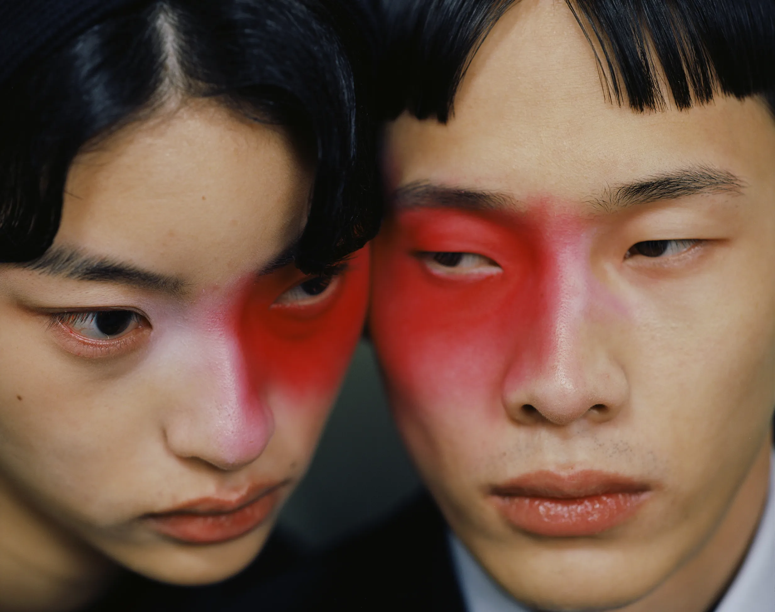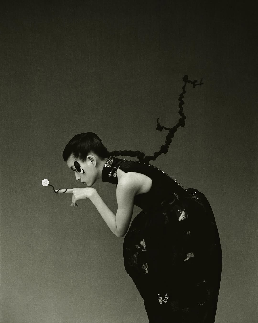 Фотограф часто использует акцентный макияж на моделях: выбеленное лицо и яркие тени, губы или румяна. Образы напоминают грим китайских оперных артистов.