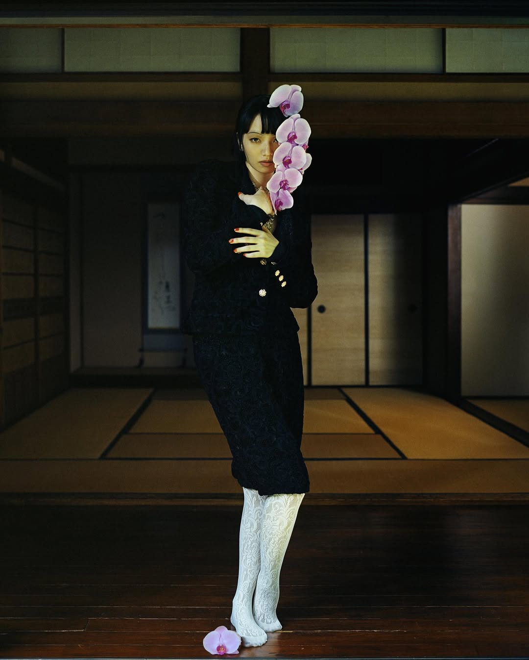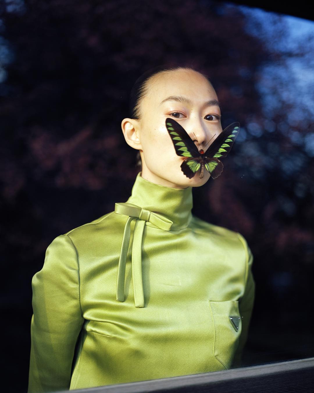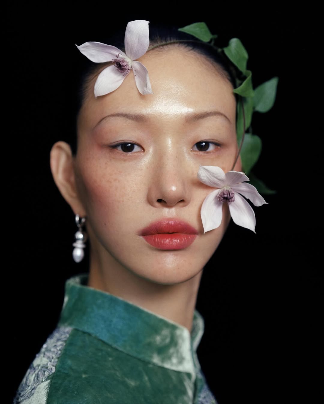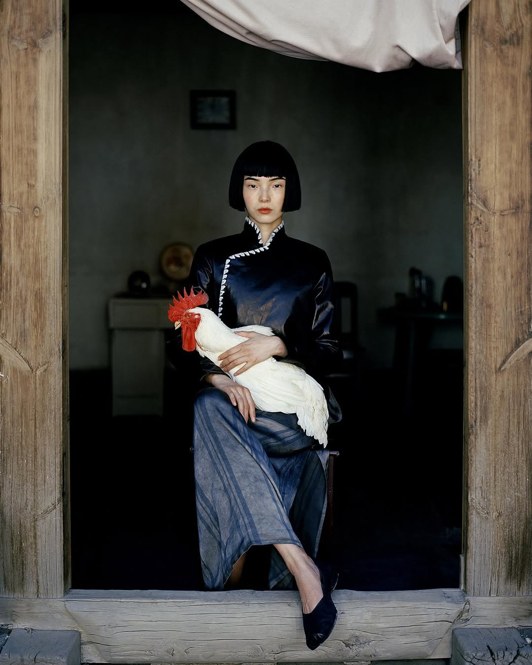 Фотограф часто использует акцентный макияж на моделях: выбеленное лицо и яркие тени, губы или румяна. Образы напоминают грим китайских оперных артистов.