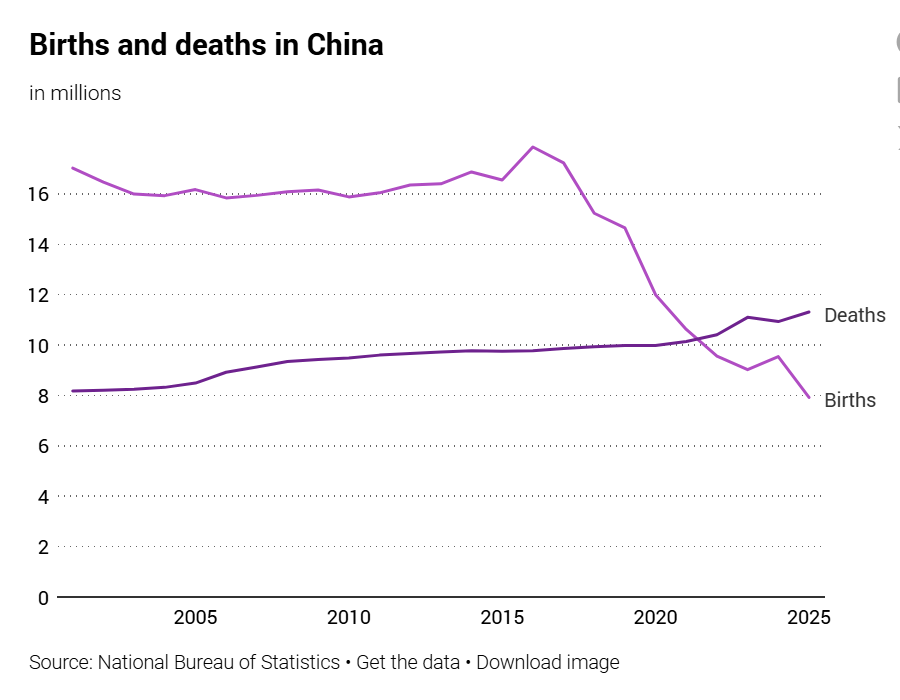 — Население Китая в течение 10 лет сократится на 60 млн — прогноз. Убыль населения Китая в течение следующего десятилетия может составить около 60 млн человек, что сопоставимо с населением Франции (68, 5 млн). Сокращение негативно скажется на производительности труда, потреблении и социальном обеспечении. Об этом говорится в исследовании Rhodium Group. Численность населения Китая снижается четвертый год подряд. В 2025 году родилось 7,92 млн детей, на 17% меньше, чем в 2024-м. К другим важным факторам относятся рост стоимости жизни и изменение настроений в обществе.